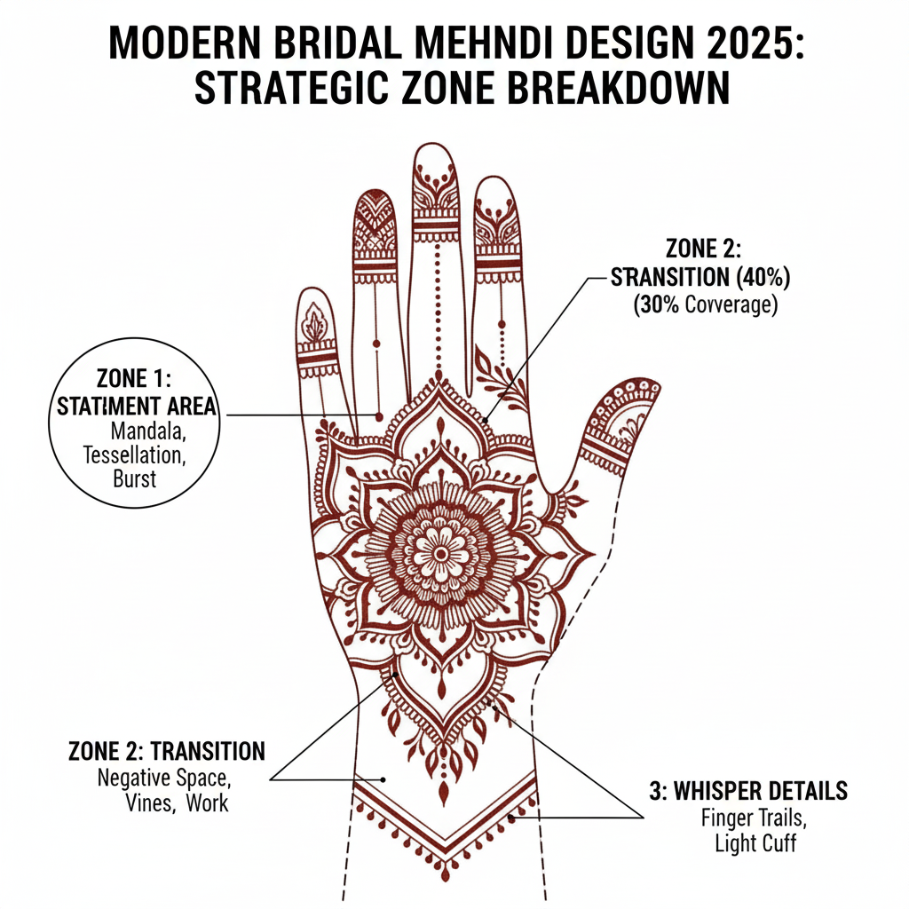 Professional designers now approach bridal mehndi design 2025 full hand using spatial zoning rather than traditional all-over coverage: